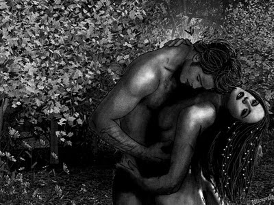 "Virou-se lentamente de costas para mim, deixando à mostra o dorso perfeito, forte, esculpido em mármore. O mar escuro brilhava ao redor dele, que se parecia ainda mais com um deus. A água escorria do cabelo e da pele molhada criando riscos prateados na pele perfeita. Minha respiração aos poucos foi voltando ao normal, e eu me aproximei dele com uma calma que não sentia, e me encostei contra ele, colando meu peito em suas costas. O choque do frio de sua pele contra a minha, fervente, me fez estremecer violentamente, e o coração voltar a disparar...(Bella)